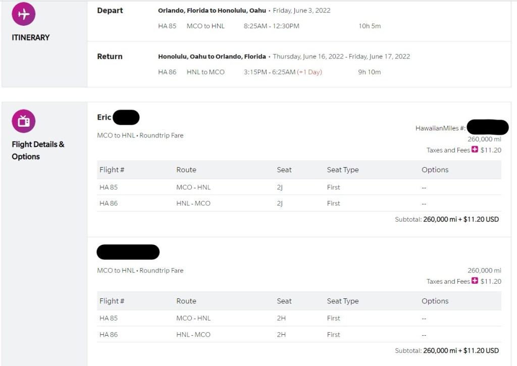 The flights that I selected provide you first class lie flat seat accommodations and 13 days in Honolulu for 260K points + $11.20 per passenger.